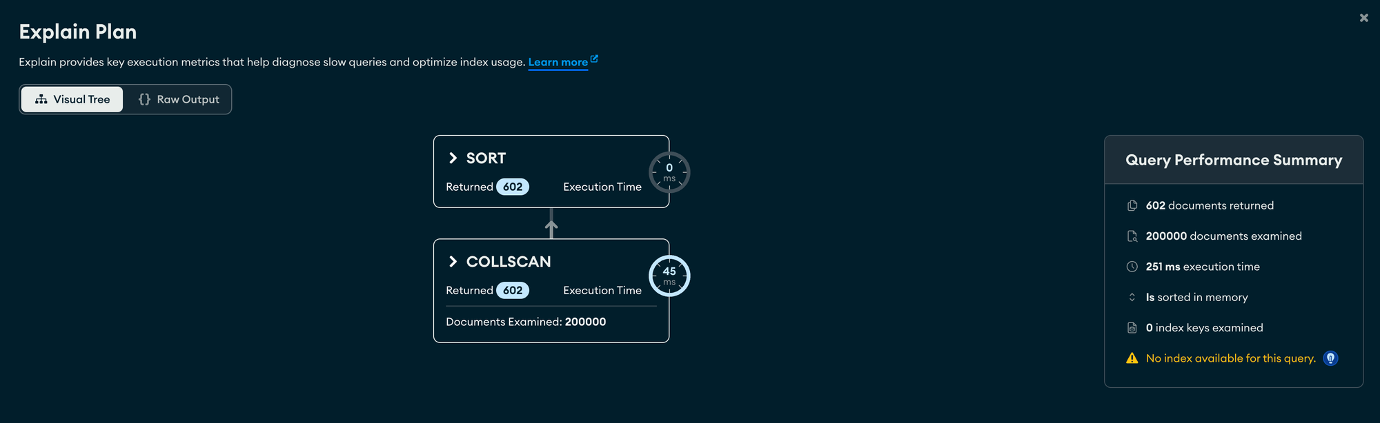 - In-memory sorting: Since there’s no index to support sorting, MongoDB sorts the results in memory.