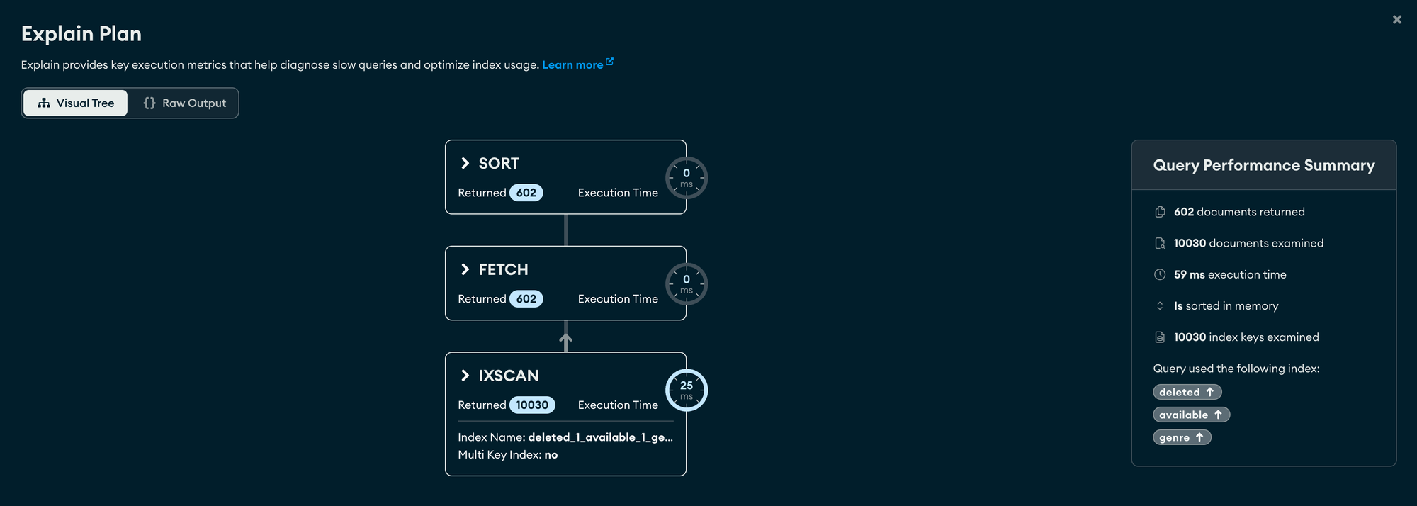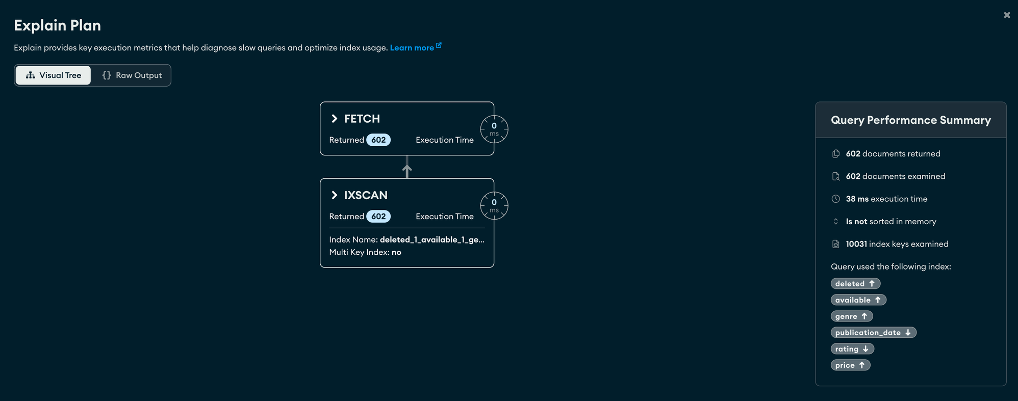 In Compass, you’ll see that MongoDB used the index efficiently to handle equality, sorting, and range conditions. There’s no COLLSCAN, and sorting is performed directly via the index.
